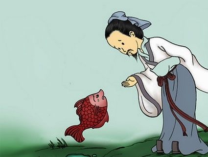 庄子坐在濮水边,头上戴着一顶草帽,眼睛紧紧盯着河面,两位使者不敢惊动庄子,只得轻轻地走向前去,对庄子说:“我们国王早就知道您的大名,想请您去楚国做宰相,协助楚王料理国事,所以派我们来请您。”