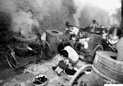 4月塞外的一个早晨天空飘洒着纷纷扬扬的雪花一个中年男子的菜摊车上坐着一个小男孩孩子用给菜保温的被子围着父亲不时用手给儿子掖掖被子